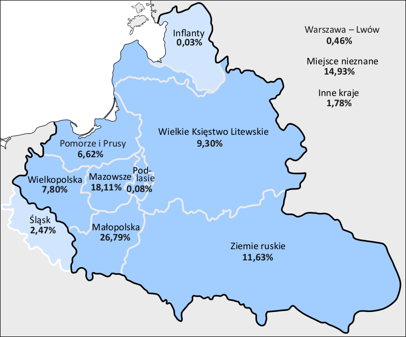 Pod względem zróżnicowania geograficznego zawartość korpusu uwzględnia teksty pochodzące ze wszystkich regionów, w których używano języka polskiego, wyróżnianych zazwyczaj w badaniach historycznych tego okresu. Są to: Mazowsze, Małopolska, Wielkopolska, Ziemie Ruskie, Ziemie Wielkiego Księstwa Litewskiego, Podlasie, Śląsk, Inflanty oraz Pomorze i Prusy. Liczba tekstów z wyodrębnionych regionów włączonych do korpusu pozostaje bardzo zróżnicowana. Stanowi ona w znacznym stopniu odzwierciedlenie aktywności piśmienniczej, a w jeszcze większym stopniu wydawniczej, poszczególnych ośrodków. Należy też wspomnieć o tym, że niektóre źródła mają nieznany region powstania, ponieważ na karcie tytułowej nie miały informacji o miejscu wydania. Z kolei region „inny” przypisaliśmy tekstom, które miały podwójne miejsce wydania: Warszawę i Lwów.