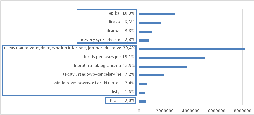 Poniższe podsumowanie ilustruje zawartość procentową segmentów korpusu w wyróżnionych rodzajach tekstów: